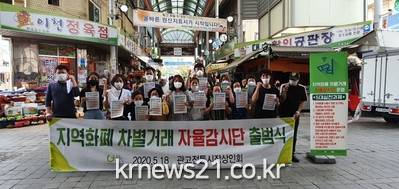 ▲ [사진제공 = 이천시]이천관고전통시장 상인회가 최근 벌어지고 있는 지역화폐 차별거래를 퇴출하고자 18일 ‘지역화폐 차별거래 자율감시단 출범식’을 가졌다.