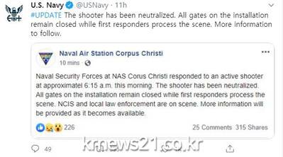 ▲ [미 해군 트위터 캡처]미국 텍사스주(州)의 해군 항공기지에서 테러로 추정되는 총격 사건이 발생했다.