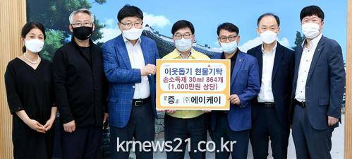 ▲ [사진제공 = 광주시]㈜에이케이 김명환 대표는 21일 광주시청을 방문, 코로나19로 어려움을 겪는 이웃들에게 전달해 달라며 식물성 손소독제(30㎖) 864개를 기탁했다.