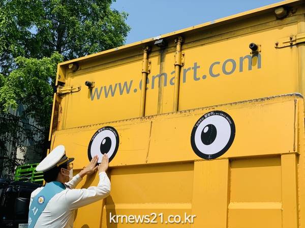 시흥경찰서가 이마트 시화물류 센터와 함께 화물차 사고 예방을 위한 '왕눈이 스티커 부착