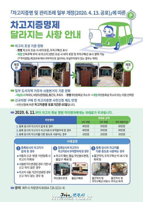 제주시에서는 도심지 주차난 해소와 주택가 주차환경을 개선하고 차고지증명제의 안정적 정착을 도모하기 위한『자기차고지 갖기사업』에 총예산 10억을 확보하여, 현재까지 총 예산의 60%까지 신청을 받았다고 밝혔다.