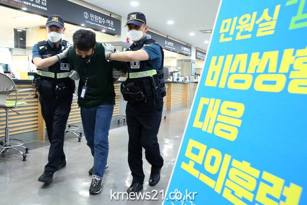 특히 경찰 112상황실과 연계된 비상벨 호출을 통해 경찰이 신속하게 출동, 가해 민원인을 제압하는 등 실제상황을 연출하여 훈련 효과를 높였다.
