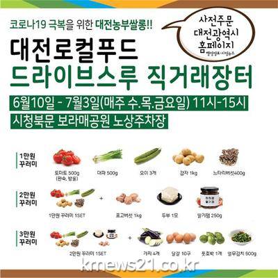 대전시는 오는 10일부터 내달 3일까지 매주 수, 목, 금요일 오전 11시부터 오후 3시까지 시청 북문 앞 보라매공원 주차장 일원에서 드라이브스루 꾸러미 장터를 연다고 7일 밝혔다.