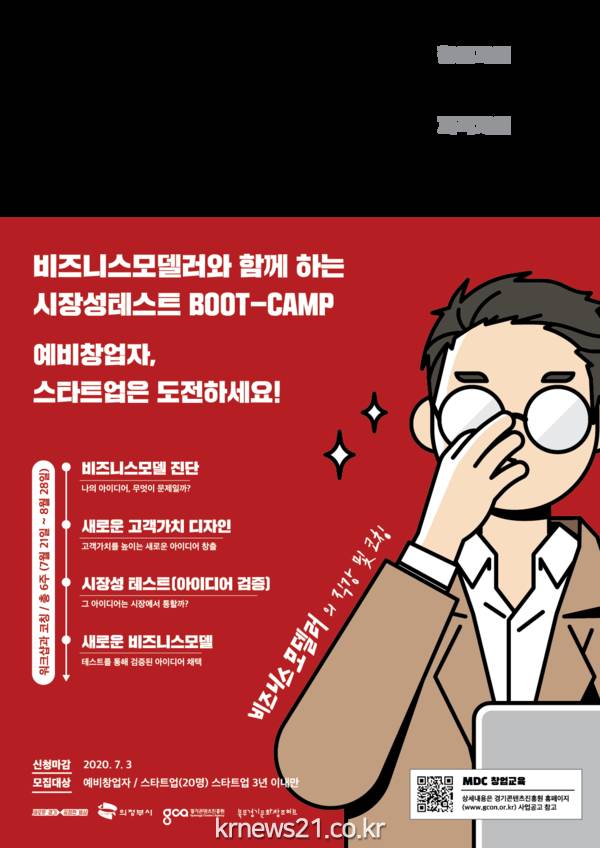 북부 경기문화창조 허브에서 진행하는 「시장성 테스트 boot-camp」 과정은 7월 3일까지 신청할 수 있으며 자세한 사항은 경기콘텐츠진흥원 홈페이지(www.gcon.or.kr)의 사업공고 게시판을 참고하면 된다.