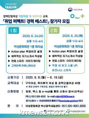 ▲ [사진=홍보포스터]부산시 여성문화회관은 코로나19로 인한 취업난을 극복하고, 경력단절 여성들의 직장 적응과 복귀를 지원하는 교육 프로그램 「취업 퍼펙트! 경력 베스트!」 참가자를 모집한다고 밝혔다.