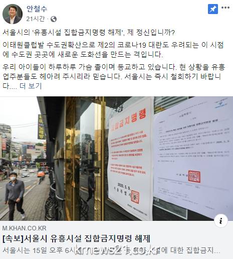 ▲ [안철수 대표 페이스북 캡처]안철수 국민의당 대표가 서울시의 룸살롱 등 일반 유흥시설에 대한 집합금지 명령을 해제하고 제한을 완화한 조치를 거론하면서 “제정신이냐”면서 강도높게 비판했다.