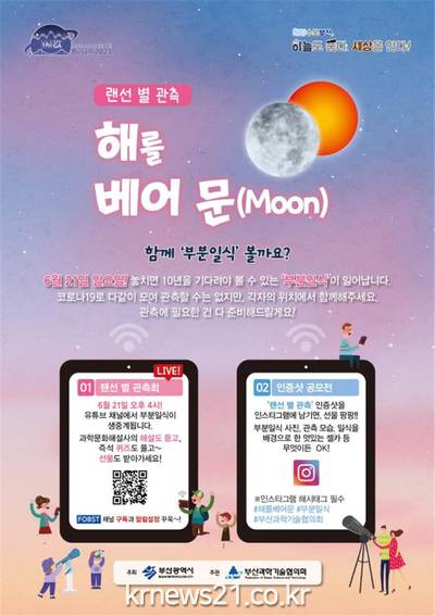 ▲ [사진=홍보포스터]부산시(시장 권한대행 변성완)와 (사)부산과학기술협의회는 6월 21일 오후 4시부터 유튜브를 활용, 온라인으로 2시간 동안 부분일식 현상을 생중계할 예정이라고 밝혔다.