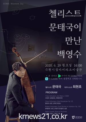 수원시립미술관이 6월 29일 16시부터 온라인으로 생중계하는 ‘첼리스트 문태국이 만난 백영수’는 온라인 동영상 플랫폼으로 전시회 ‘백년을 거닐다 : 백영수 1922~2018’을 관람하고, 첼리스트 문태국과 피아니스트 최현호의 연주를 감상할 수 있는 비대면 공연이다. 전시·연주회 장소는 수원시립아이파크미술관 전시실이다.