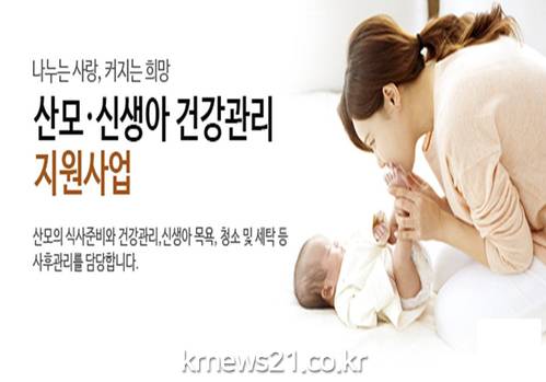 산모신생아 건강관리 지원사업은 출산 가정에 건강관리사를 파견하여 산모의 산후회복과 영양관리를 돕고 신생아 돌봄 서비스와 가사활동 지원을 통해 출산가정의 경제적 부담을 경감하여 주는 사업이다.