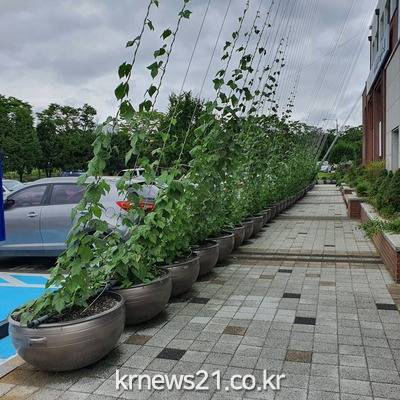 5월에 시설물을 설치하고, 나팔꽃·제비콩 등 덩굴식물을 심었다. 현재 식물이 무럭무럭 자라고 있다. 이번 달 말이면 건물 벽면을 뒤덮을 것으로 보인다.