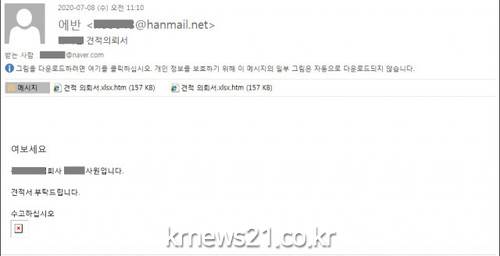 먼저 ‘견적의뢰서’ 위장 메일의 경우 공격자는 특정 기업을 사칭해 ‘OOO(특정 기업명) 견적의뢰서’라는 제목의 메일을 보냈다. 본문에는 ‘견적서를 부탁한다’는 내용을 적고 엑셀 문서로 위장한 ‘견적 의뢰서.xlsx.htm’이라는 제목의 인터넷 문서 파일(.htm)을 첨부했다. 만약 사용자가 무심코 이 파일을 실행하면 포털 사이트 로그인 화면으로 위장한 피싱 페이지로 연결된다.