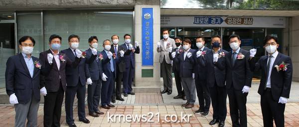 경기 주택 도시공사(사장 이헌욱)는 15일 새로운 사명을 기념하기 위한 현판식을 개최하고 새 기업 이미지를 공개했다.