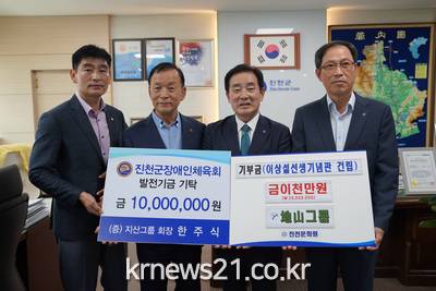 15일 군에 따르면 이날 기탁식에는 송기섭 진천군수, 한주식 지산그룹 회장, 장주식 문화원장이 참석한 가운데 진행됐으며 이상설선생기념관 건립기금으로 2,000만 원을, 진천군장애인체육회 후원금으로 1,000만 원을 각각 전달했다.