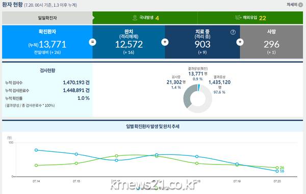 질병관리본부 중앙방역대책본부에 따르면 20일 0시 기준 국내 코로나19 신규 확진자는 26명으로 누적 확진자는 1만3771명이라고 밝혔다.
