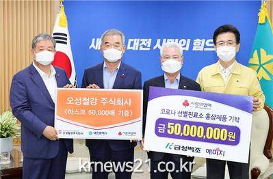 대전시는 20일 오전 11시 시청 응접실에서 허태정 대전시장과 정성욱 금성백조 회장, 정태희 대전사회복지공동모금회장이 참석한 가운데 5,000만 원 상당의 현물 기탁식을 가졌다고 밝혔다.