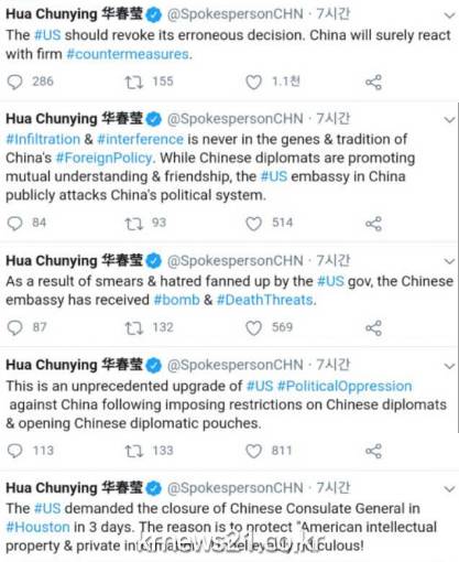 화 대변인은 23일 자신의 트위터를 통해 미국 정부가 텍사스주(州) 휴스턴에 있는 중국 총영사관을 3일 내에 폐쇄하라고 요구했다는 사실을 언급하면서 “미국의 지적재산권과 개인정보를 보호하기 위한 것이라고 한다. 믿기 어려울 정도로 말도 안되는 일!”이라고 적었다.