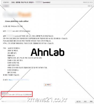 먼저 공격자는 소프트웨어 개발자 등 IT업계 종사자가 이용하는 국내 IT커뮤니티 사이트의 자료실 게시판에 개발용 프로그램 소개를 위장해 게시물을 올렸다. 게시물의 첨부파일에는 공격자가 악성코드를 삽입해 변조해놓은 개발용 유틸리티 프로그램(해외 무료 소프트웨어) 설치 파일을 압축파일 형태로 업로드해 커뮤니티 이용자의 다운로드를 유도했다.