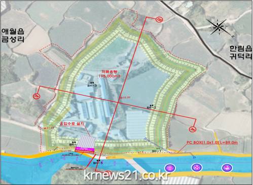 우수저류지 시설사업은 총사업비 23,150백만원(국비 : 11,575백만원, 지방비 : 11,575백만원)을 투자하여 2021년까지 저류지 조성을 완료할 계획으로 제주시 애월읍 금성리 888-8번지(A=47,689㎡) 일원에 저류용량 195,000㎥ 규모로 조성된다.