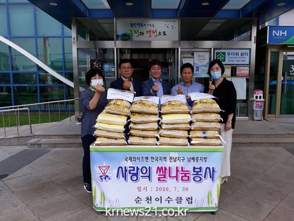 국제와이즈맨 순천이수클럽(회장 조정현)은 지난 30일 어려운 이웃들을 위한 사랑나눔 후원물품으로 쌀 200kg를 기증했다.