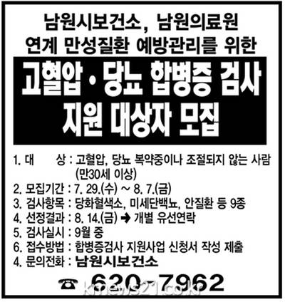 ▲ [사진=홍보포스터]남원시보건소(소장 이순례)는 남원의료원 공공의료팀과 연계하여 시민의 만성질환 예방관리를 위해 고혈압‧당뇨 합병증 검사를 지원한다. 심뇌혈관질환의 주요 선행질환인 고혈압‧당뇨병의 합병증 조기발견 및 치료를 위해 고혈압‧당뇨병으로 약을 복용하고 있는 만 30세 이상 남원시민 중 합병증이 우려되는 심뇌혈관질환 고위험군 40명을 선정해 검사를 지원한다.