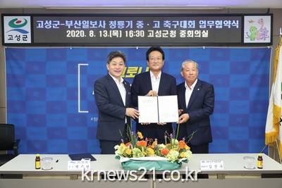 고성군(군수 백두현)은 8월 13일 오후 4시 고성군청 중회의실에서 백두현 고성군수, 김진수 부산일보사 대표, 최철수 부산광역시축구협회장 등이 참석한 가운데 「청룡기 전국중학교축구대회 및 전국고등학교 축구대회」 개최를 위한 업무협약을 체결했다.