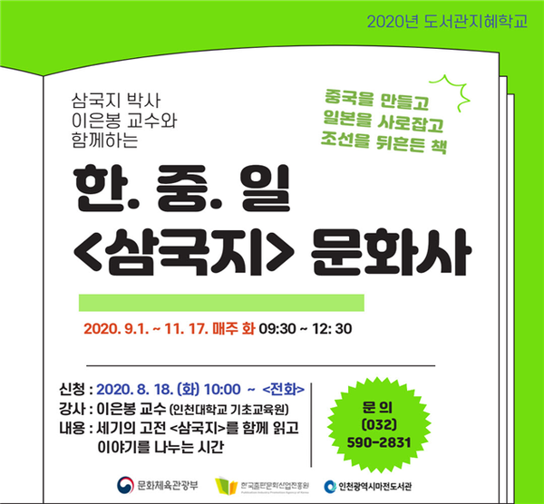 인천광역시(시장 박남춘) 마전도서관이 문화체육관광부가 주최하고 한국출판문화산업진흥원이 주관하는 ‘2020년 도서관 지혜학교’사업 수행기관으로 선정되어‘한·중·일 <삼국지> 문화사’ 프로그램을 운영한다.