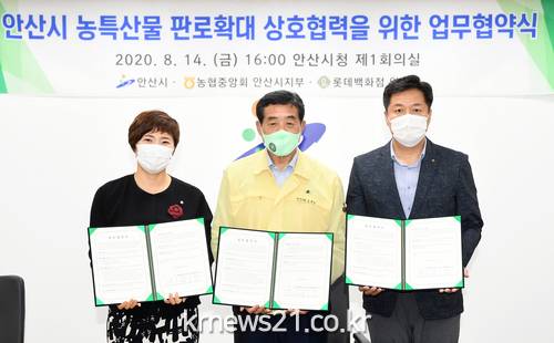 지난 14일 시청에서 진행된 업무협약식에는 윤화섭 안산시장을 비롯해 황준구 농협중앙회 안산시지부장, 한지연 롯데백화점 안산점장 등 관계자가 참석했다.
