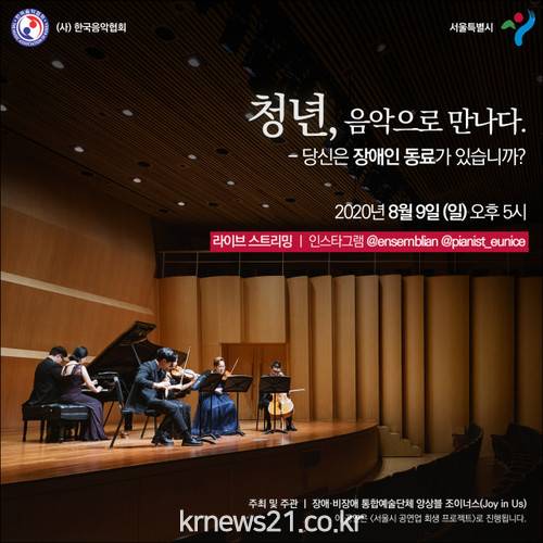 ▲ [사진=홍보포스터]장애 예술청년과 비장애 예술청년의 화합으로 많은 이의 주목을 받고 있는 통합예술단체 앙상블 조이너스가 8월 9일 서울 강남구 앙상블리안 홀에서 랜선 콘서트를 열었다고 24일 밝혔다.