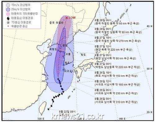 26일 기상청에 따르면 이날부터 27일까지 제주 산지를 중심으로 최고 500㎜가 넘는 많은 비가 내리고 최대 순간 풍속 초속 60m에 이르는 강한 바람이 불 것으로 예보됐다. 이에 따라 제주는 현재 육상과 해상에 태풍경보가 내려진 상태다..