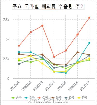 폐의류는 7월말 기준으로 수출량이 작년 수준으로 회복된 것으로 보이며, 특히 주요 수출국 대상 수출량이 올해 4월에 비해 상당히 회복된 것으로 나타났다.