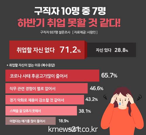 ▲ [자료제공 = 사람인]코로나19 사태 장기화로 기업들이 인재 채용에 보수적인 기조를 유지하면서, 하반기 취업 성공에 자신이 없는 구직자들이 10명 중 7명을 넘는 것으로 나타났다.