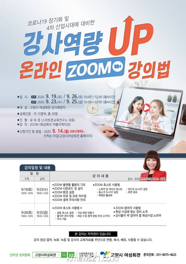 고양시 여성회관은 코로나19로 인한 강사들의 경력단절을 극복하고 재취업을 돕기 위하여 『강사역량up 온라인zoom강의법』 교육을 무료로 운영한다고 10일 밝혔다.