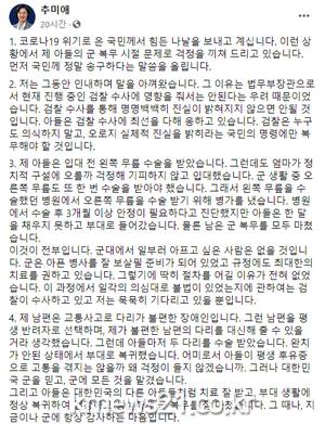 그러면서도 "아들의 휴가와 관련해 딱히 절차를 어길 이유가 전혀 없었다"며 "이 과정에서 일각의 의심대로 불법이 있었는지에 관해 검찰이 수사하고 있고 저는 묵묵히 기다리고 있을 뿐"이라고 덧붙였다.