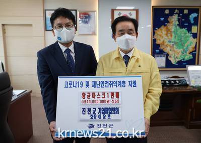 이운로 진천군기업체협의회장은 15일 진천군청을 방문해 지역 어르신들을 위해 사용해 달라며 마스크 1만장을 기탁했다.