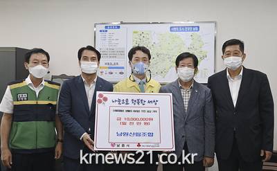 남원시는 9월 16일 남원산림조합에서 1,000만원을 기부했다고 밝혔다. 윤영창 조합장은 “최근 발생한 호우피해로 힘든 일상을 겪는 주민들에게 깊은 위로를 전하며, 생활이 어려워진 주민에게 꼭 필요한 도움을 드리고 싶었다.”고 전했다. 이어 “앞으로도 남원산림조합은 어려움에 처한 이웃에 대한 지속적인 관심과 지원을 위해 노력할 것”이라고 덧붙였다.