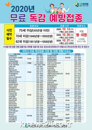 접종기간은 만 75세 이상 어르신은 10.13.~백신 소진 시까지, 만 70세 이상 어르신은 10.20.~백신 소진 시까지, 만 62세 이상 어르신은 10.27.~백신 소진 시까지 관내 지정 병·의원 76개소에서 접종을 시행한다. 그리고 기초생활수급자, 장애인, 국가유공자, 만성질환자는 이천 시민에 한해 10. 27.~ 백신 소진 시 까지 보건소에서 접종을 실시한다.
