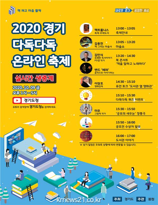 올해로 5회째를 맞는 ‘2020년 경기 다독다독 축제’는 경기도의 대표 책 축제로 올해는 사회적 거리 두기를 고려해 비대면으로 진행하며 경기도청 유튜브 채널을 통해 생중계된다. 마술쇼를 시작으로 북 콘서트, 퓨전 토크, 퀴즈 이벤트, 인형극 등 다양한 행사가 준비돼 있다.