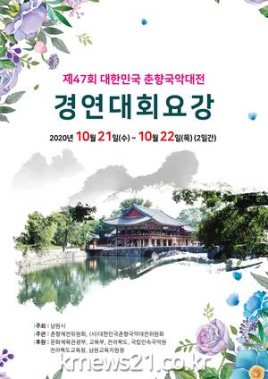 ▲ [사진=홍보포스터]코로나19로 연기되었던 제47회 대한민국 춘향국악대전이 10월 21일부터 22일까지 춘향문화예술회관과 함파우소리체험관에서 비대면과 대면을 병행하여 2일간 개최된다.