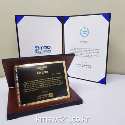 ▲ [사진제공 = 대구광역시]대구도시철도공사(사장 홍승활)는 지난 23일(금) 세계 어린이의 생존 보호를 위한 유니세프 활동을 지원한 공로를 인정받아 유니세프한국위원회(회장 송상현)로부터 감사장과 감사패를 받았다고 밝혔다.