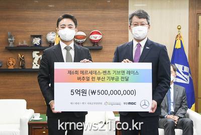 지난 10월 성황리에 종료된 비대면 마라톤 행사의 대회 참가비로 조성된 이번 기부금 총 5억 원이며, 이는 부산지역 5개 복지법인에 나누어져 아동·청소년의 의료비와 교육비로 쓰일 예정이다.