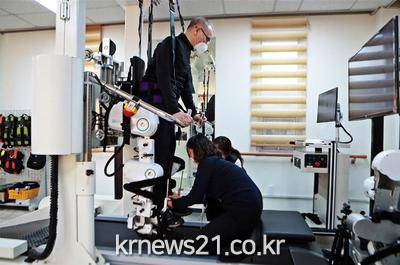 ▲ [사진제공 = 평택시]평택시(시장 정장선)는 지난 4일 평택보건소에 위치한 로봇보행 재활운동실에서 보행지도가 필요한 지역사회 장애인을 대상으로 「로봇보행 재활운동실」을 개시했다고 밝혔다.
