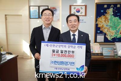㈜한성환경기연 김동규 대표는 11일 진천군청을 찾아 재단법인 진천군장학회(이사장 송기섭)에 1,000만 원의 장학금을 기탁했다.