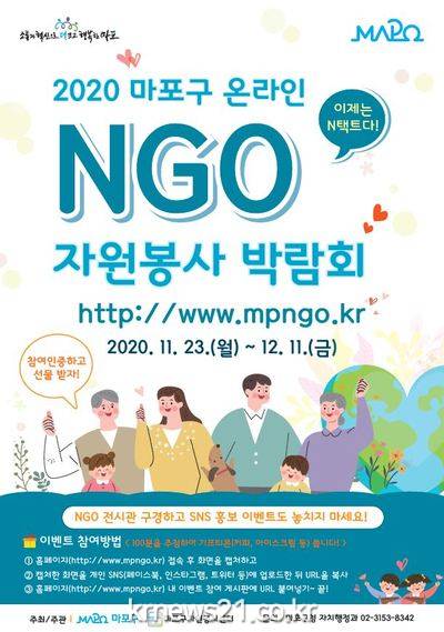 마포구(구청장 유동균)가 지역 내 NGO 단체의 자립 및 역량강화, 홍보 등을 위해 ‘2020 마포구 온라인 NGO 자원봉사 박람회’를 23일부터 12월 11일까지 온라인으로 개최한다고 밝혔다.