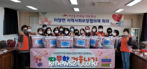 미양면지역사회보장협의체(공공위원장 양승동, 민간위원장 송영철)에서 지난 23일 「따뜻한 겨울나기 사업」으로 관내 주거환경이 열악한 저소득층 52가구에 발열이불을 전달했다.