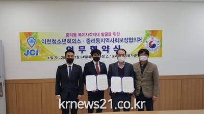 ▲ [사진제공 = 이천시]이천시 중리동지역사회보장협의체(공공위원장 윤희동, 민간위원장 신인철)는 24일 이천청년회의소(노진호 회장)과 업무협약을 체결했다고 밝혔다.