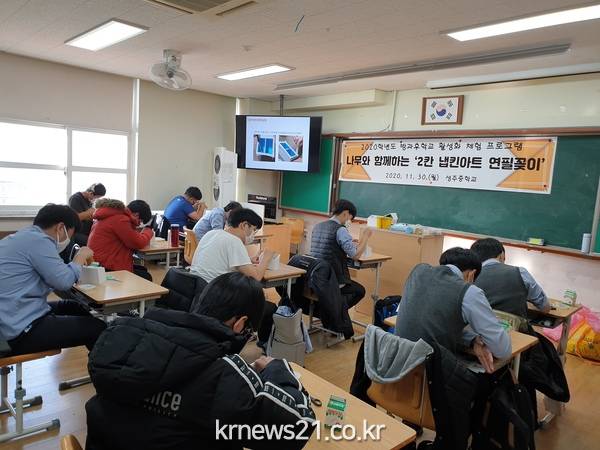 성주중학교(교장 황규형)는 방과후학교의 활성화를 통해 다양한 교육활동 참여 기회를 학생들에게 제공하고자 냅킨아트와 목공예를 결합시킨 ‘2칸 냅킨아트 연필꽂이’ 체험 프로그램을 계획하여 실시하였다.