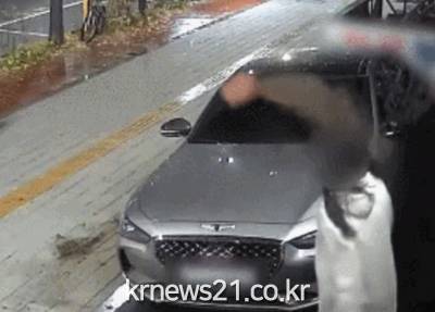 ▲ [온라인 커뮤니티 `보배드림` 캡처]술 취한 여성이 거리에 주차된 제네시스 차량에 화분을 던져 손괴하는 일이 발생했다. 피해 차주는 이 장면이 담긴 폐쇄회로(CC)TV 영상을 공개하며 범인 찾기에 나섰다.