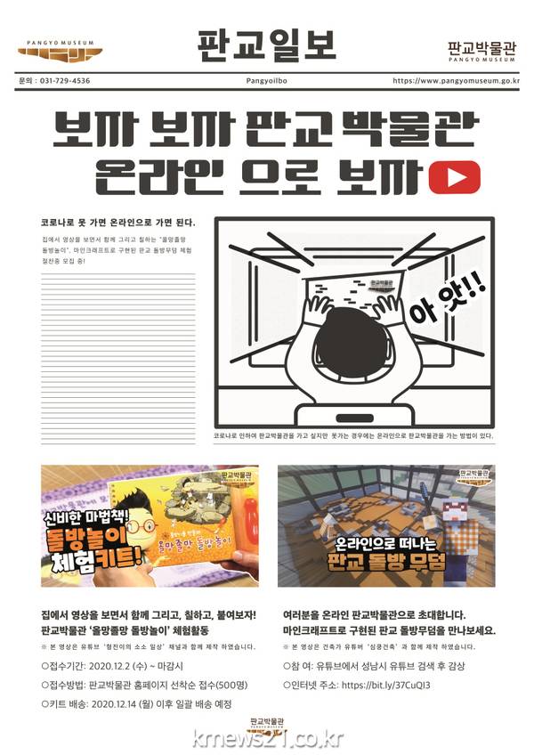 판교박물관 홈페이지(https://www.pangyomuseum.go.kr)의 ‘교육 및 행사- 교육예약 - 초등프로그램’에서 신청 가능하며, 오는 14일 이후 순차적으로 우편 배송될 예정이다. 자세한 사항은 판교 박물관(☎031-729-4536)로 문의하면 안내받을 수 있다.