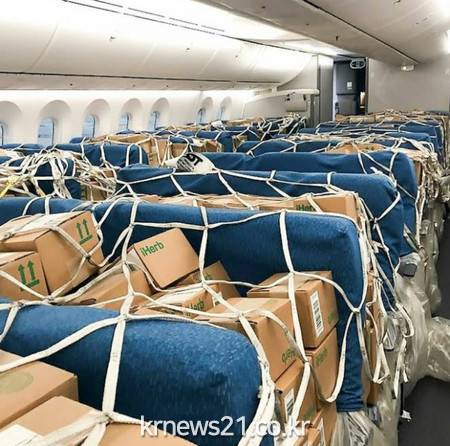 ▲ [사진제공 = 아이허브]세계 최대 웰니스 전문 유통 플랫폼 ‘아이허브’가 블랙프라이데이 시즌에 발생한 직구 배송 대란을 해결코자 화물칸뿐 아니라 항공기 좌석, 짐칸(오버헤드빈)까지 빌려 제품 발송을 실시하고 있다.