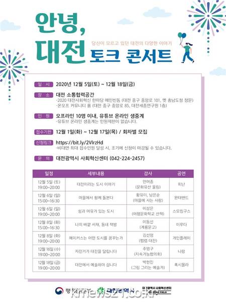 ▲ [사진=홍보포스터]대전시는 지역거점별 소통협력공간 조성(COMMONZ FIELD 대전) 사업의 일환으로 12월 5일부터 18일까지 토크콘서트‘안녕, 대전’을 온라인으로 진행한다고 7일 밝혔다.